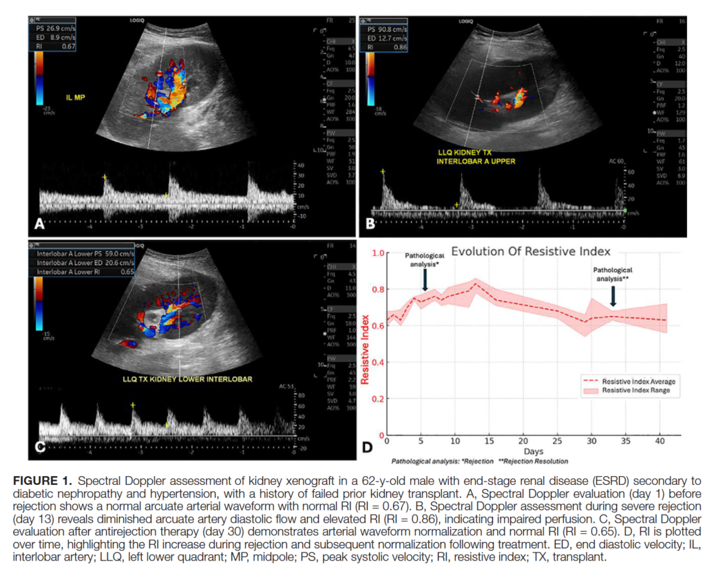 Methods: We report the first application of longitudinal grayscale, color, and spectral Doppler ultrasound in 2 human recipients of genetically engineered porcine kidney xenografts. One recipient additionally underwent serial contrast-enhanced ultrasound to assess parenchymal perfusion. Imaging findings were correlated with serum creatinine trajectories and biopsy-proven rejection.